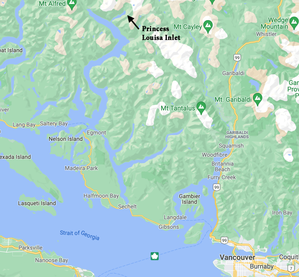 We are headed to Princess Louisa Inlet for New Year’s Day. Princess Louisa Inlet is a 5-mile long finger of sea at the head of a fjord about 60 miles north of Vancouver, BC (as the eagle flies), but almost 100 sea miles away.