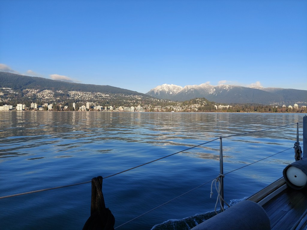 About noon, we dragged our sorry backsides onto a snow- and ice-covered dock in False Creek (a waterway in downtown Vancouver), called the CBSA, and hoped that they would let us in this time. In less than five minutes the team of four agents arrived to begin check in procedures. I’m sure that they were ready to dig through everything on the boat, as there had to have been some very strong chemistry on board to make some relatively normal people come through the storm on the Strait. After finding everything in order, they checked us in and cleared us to continue traveling. They decided that the inspection that the other team had done was good enough. They probably thought insanity was communicable, and didn’t want to be infected!