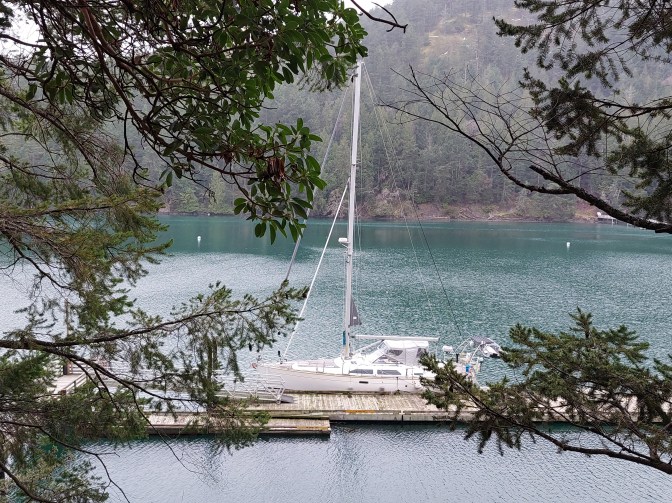 Braesail arrived on Tuesday in nearby (and less expensive!) Canoe Cove Marina with a two-person crew aboard, water tanks filled, and temperatures rising a little. After a “rest day” of reading, emailing, and blogging, Wednesday’s motoring journey took the boat to the dock in roomy Reid Harbor on Stuart Island, where Braesail was the only boat.