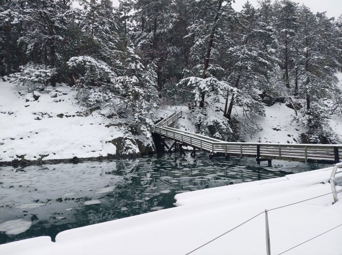 By bedtime, several inches of snow had wrapped the harbor in a white blanket, and on the morning of Thursday, January 6, the Feast of the Epiphany, Braesail’s captain and crew looked out the port lights at a gorgeous epiphany–an icy fairy-tale world enfolded in a half-foot of fluffy snow. Walt made a photo-shooting hike to the shore and back and Lorelette took pictures from the cockpit. What a magical place in which to spend a quiet day!