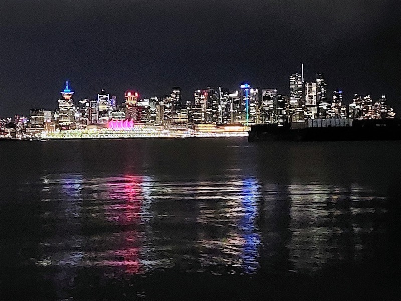 After our wonderful meal and visit, Walt and I walked from Martin’s apartment to a bus stop and rode the bus back to North Vancouver, walking from our stop to the Burrard Yacht Club gate and then back to Braesail, having taken nearly 9,000 steps over the course of the day (about 4.5 miles’ worth). After admiring the view of the city lights from across the water from our dock, we retired for the night.