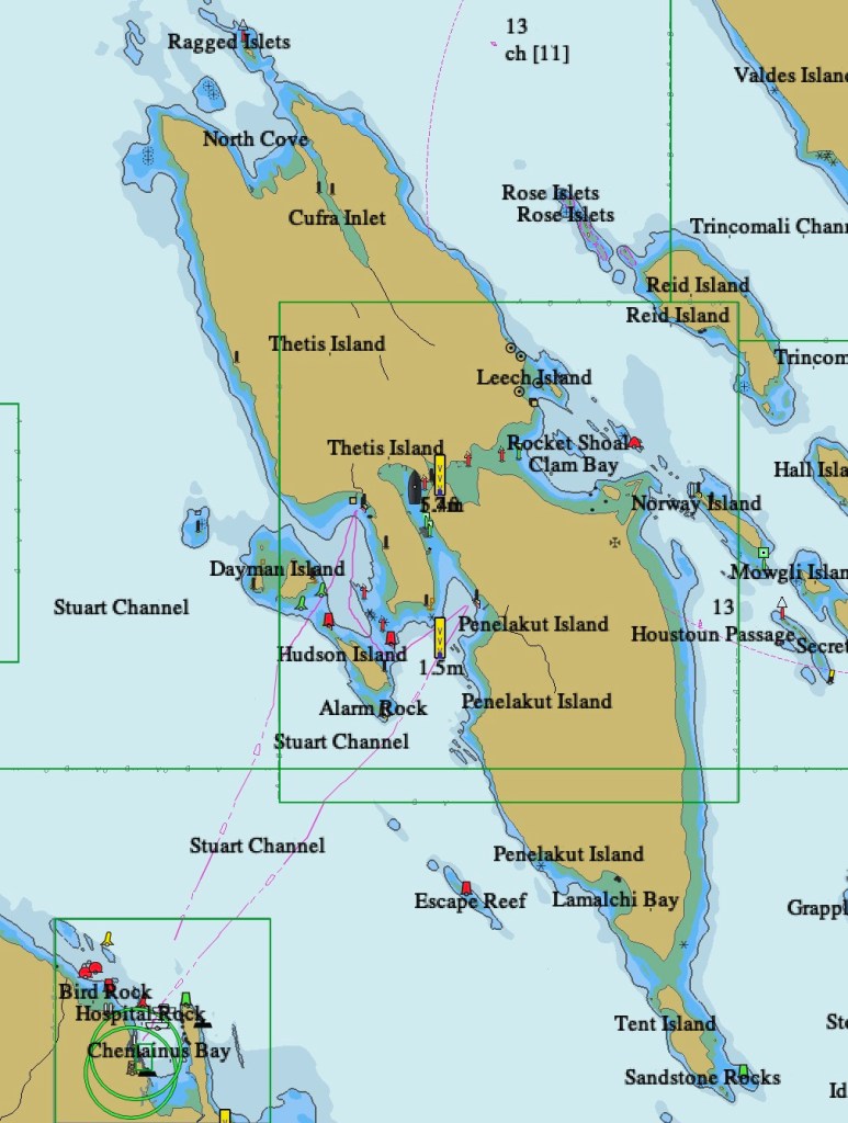 We sailed deeper into the Harbour, passed the “Cut”, which allows the passage of small shallow boats from Clam Bay on the east side of the islands into Telegraph Harbour, and tied up at a small marina on the southern edge of Thetis Island.