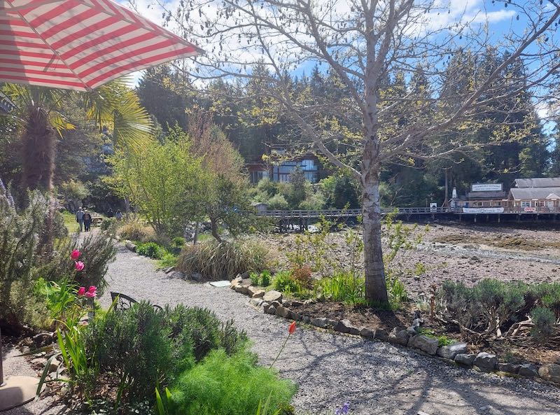 The skies were sullen as we motored for about two hours in almost no wind, past the wide variety of houses on the shores of British Columbia on our right (starboard side) and lovely, forested, drift-log-bordered islands to our left (port side). By noon, the sun had finally climbed out of its fluffy cloud bed, and we were tied up at the dock in Lund Harbour. We had one hour during which to hurry up to shore, buy our favorite frosted blackberry-cinnamon buns at the famous (deservedly so!!) Nancy’s Bakery, grab a small lunch there, get back to Braesail, and continue our journey (otherwise, you pay about $1 per foot of boat length as your mooring fee for one day). We purchased the buns, a sandwich lunch, and a loaf of fresh sourdough bread, returned to the boat, and left in time to avoid staying past the expiration of our “grace period.”