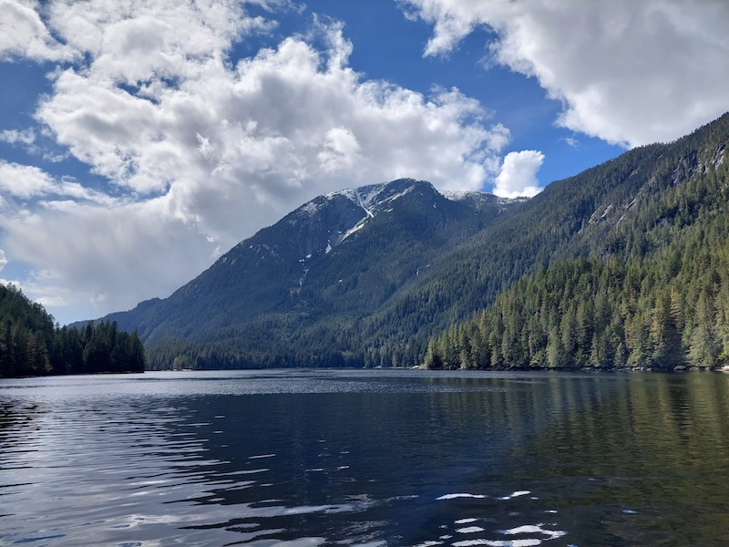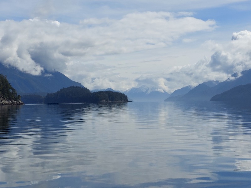At about 10 am, we motored away from Lagoon Cove and toward awe-inspiring Kwatsi Bay, one of my favorite places, where we had anchored beneath soaring, cascade-laced cliffs in 2017 and watched an amazingly athletic water ballet performed by a troupe of dolphins! It was wonderful to be traveling in sunshine along calm, forest-lined waterways above which sky-piercing peaks, wrapped in glistening white snow-shawls, played “peak-a-boo” with billowing cumulus clouds!