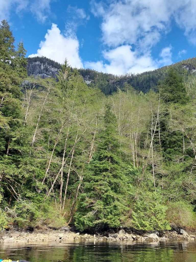 Waterfalls cascading down the rock faces above Kwatsi Bay’s shore and tiny rapids lining it