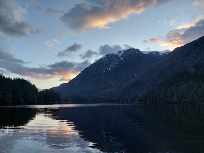 During the evening, without any connectivity to allow us to do online research or to receive and write email (or make blog posts!), we read BOOKS and worked on planning Saturday’s journey to Simoom Sound. Such trip planning requires making reference to wind and weather information (obtained via radio), printed guides to the times, heights, and strengths of daily tides and currents, maps showing water depths and various navigation hazards, and several cruising guides that provide information about spots in which one might spend the night: their history, the safest approaches to them, any special features and/or services provided, and the best places in which to drop anchor if one is not tying up at a dock. A good project to engage me as the day faded into a chilly, mountain-hugged night.
