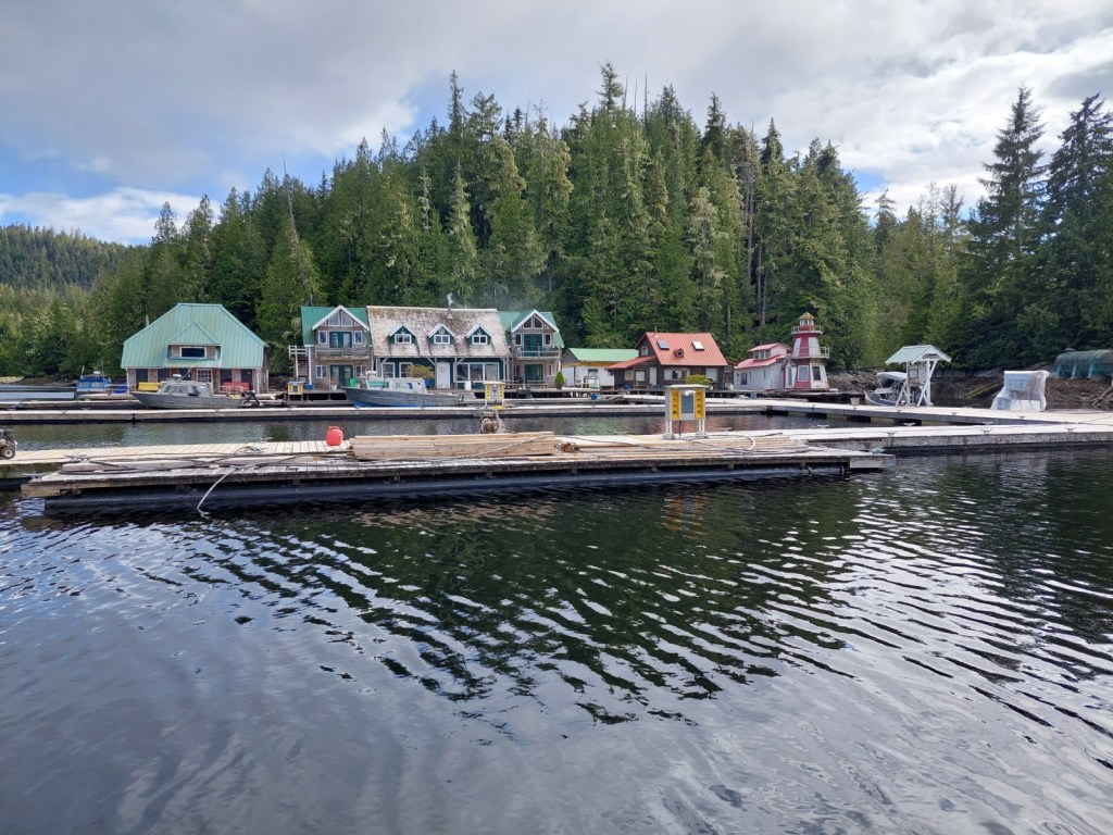 The brief motor trip from O’Brien Bay in Simoom Sound on Sunday morning to the Echo Bay Marina was a pleasant one made under mostly cloudy skies. The resort/marina was purchased by the local First Nation in 2020 (visit https://kwaxwalawadi.com/ for information) and has been a popular destination for boaters for many years. Our tying up at the dock was assisted by Jackson from the marina and his young dog, Coco, and by Jim from the Nordic Tug, Sea Spirit–we had encountered him and his crew twice before, at Port Neville and at Lagoon Cove.