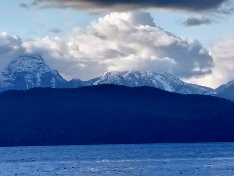 Afternoon view of the “shy” mountains attempting to hide in the clouds opposite Echo Bay