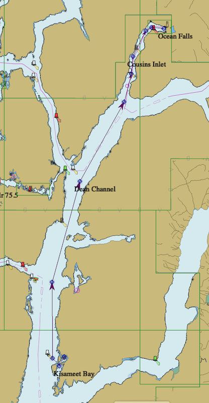 From Kisameet Cove in Kisameet Bay (bottom left) to Ocean Falls (top right)