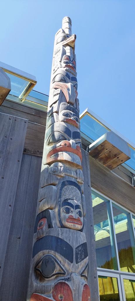 we rented a car after a big public breakfast in the Community Center, picked up some groceries, watched the parade, and drove the short distance to the town of Skidegate to spend the afternoon at the beautiful and well-designed Haida Heritage Centre, at which we learned a great deal about Haida history, art, and culture, and about the geology and flora of Haida Gwaii.
