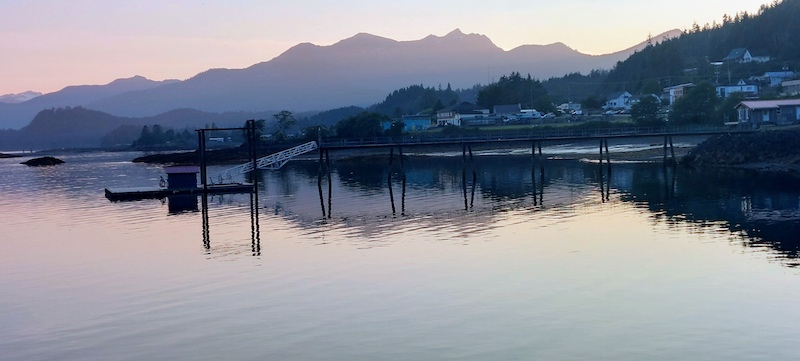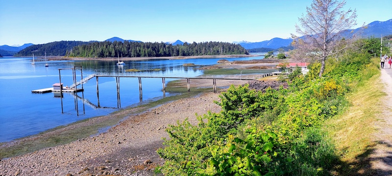 Today was a long-awaited festival day in Queen Charlotte, with food, games, arts and crafts, music, and a parade, and Walt and I loved being part of it! We’d arrived on Friday afternoon after a comfortable 7.5-hour motoring trip north from Thurston Harbour that took place mostly under overcast skies, featured some splashing by seals near the bow of the boat, and ended in sunshine, and after docking, we walked to an excellent restaurant, The Black Tail, for a fine supper.