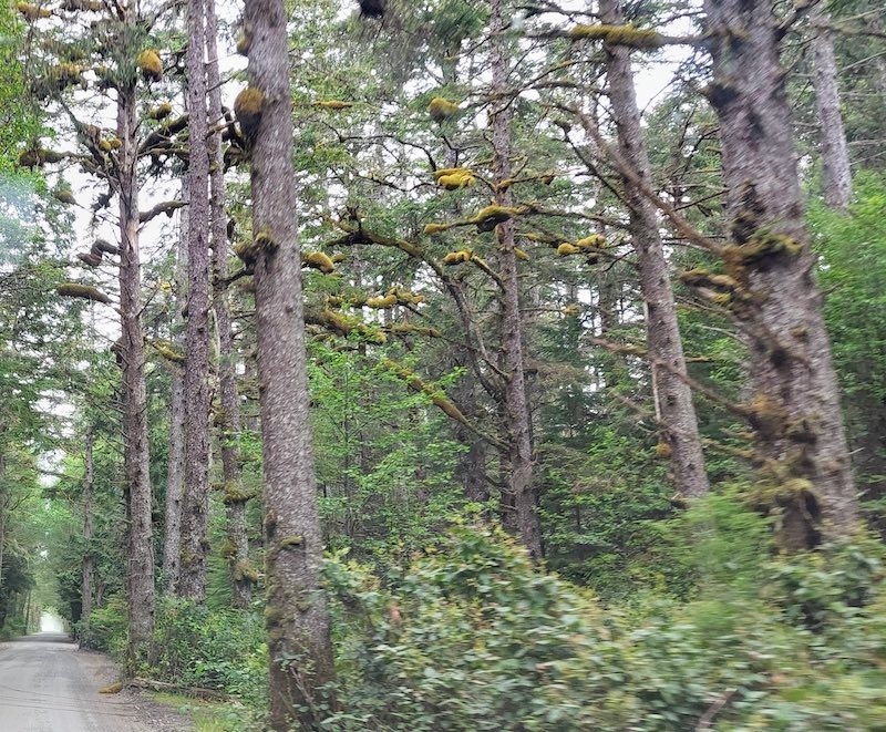 We drove through a number of fascinating ecological areas, observing flat pastureland, groves of stunted pine trees, old-growth forests, second-growth forests, marshlands and inter-tidal zones, rocky beaches, smooth sand beaches, sizeable hills, and a forest containing trees from whose limbs hung a breathtaking array of “moss creatures”–globs of heavy moss in all sizes and taking every imaginable shape from corn-dogs, sausages, balloons, serpents, small dragons, hedgehogs, otters, little bears, skinny Martians–whatever your imagination might conjure! I don’t understand the conditions under which these moss blobs form–does anyone know?