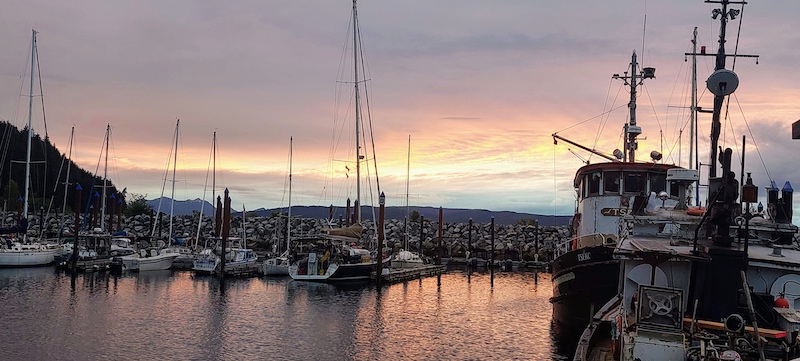 Braesail had spent most of Monday docked behind the large stone breakwater at the settlement of Sandspit, to which we’d motored on Monday morning, both to save some money on moorage fees, and to be 1.5 hours nearer to our Tuesday destination. I attempted to catch up a little on the writing and posting of blog entries and photos, since connectivity was sufficient to allow efficient work, but I didn’t quite manage to achieve my goal of updating the photos for the entries from May 30 through about June 12; I DID add some new posts and pictures. Walt completed his preparations for Tuesday’s travel and went to bed early. I made sandwiches for Tuesday’s lunch and took the attached picture of the boats in the small Sandspit marina soaking up the sunset (at about 10:30 pm) that stained the water.