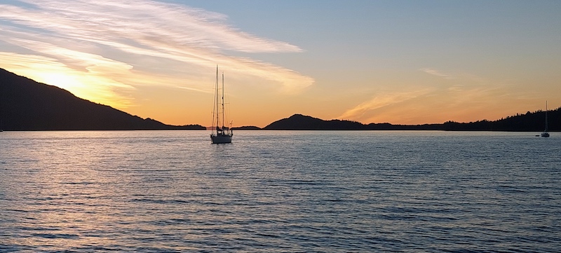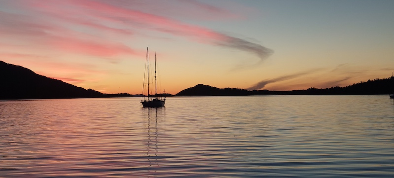By the time I was crawling into bed in the aft cabin shortly before midnight, it was still sufficiently light outside to allow me to see the water, the trees on the shores, the three sailboats sharing the cove, and the islands against the sky, and when I got up at 2 am to use the head, I couldn’t see any stars in the skies outside–there was simply too much light!