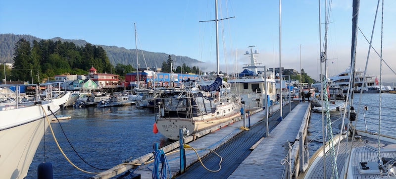 We discovered that the sailboat, Zig Zag, which we’d first encountered in Shoal Bay and then met again at the Windy Bay Watchman site on Lyell Island in Haida Gwaii, was docked right in front of Braesail, and it was nice to see Will and Kelsey again! We are heading in different directions, and we wish them the best after they experienced a VERY uncomfortable and exhausting crossing of Hecate Strait!
