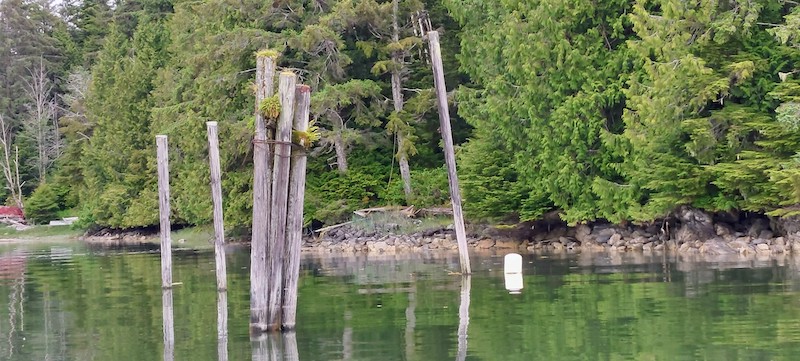As usual, there was scarcely any wind, and the 4-hour, 24-mile journey over a sea of gently rippled pewter was uneventful. We passed the shore-side Tsimshian village of Metlakatla (from which about 800 residents left in 1886 with the Anglican Missionary, William Duncan, to establish a new town– Metlakatla, AK–which we hope to visit on our way back south to Everett) that is presently closed to those who are not members of the band, and dropped anchor in quiet Russell Arm, which presents a “study in green!”