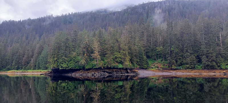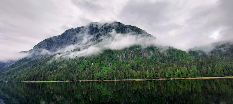 These are views of Punchbowl Cove taken from Braesail as I walked around her decks. Above, a scarf of mist puffs wraps itself around a grand granite peak’s shoulders.Here, misty wraiths look down at their rippled reflections while tiny snow faces peep out from the granite mountain tops above.Mist ghosts sneak up the wooded slopes above the cove’s still watersThe cove’s surface waters transition into mirrors after a rain, and an island floats atop its watery image.A wreath of mist rings a monumental granite outcropping. At the waters’ edge, a green-gold necklace of marsh grass and rockweed shimmers the shore.