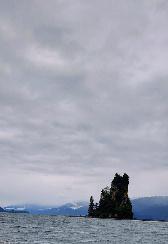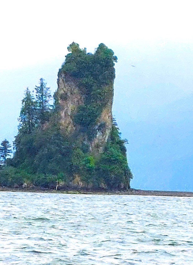 We left Wednesday night’s anchorage (Winstanley Cove in Shoalwater Pass) on Thursday and misted past the remarkable New Eddystone Rock, one of this area’s best-known landmarks. Does the mammoth lava tube tower in Behm Canal look to you like a 230-ft.-tall monster feline constructed out of stone, trees, and brush and seated on the sea?