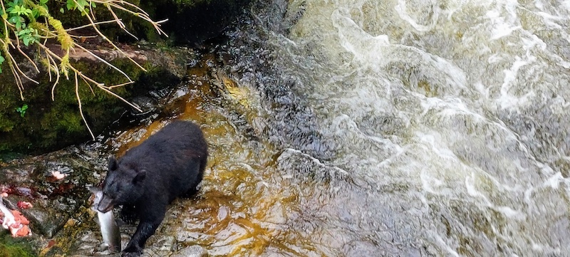 This morning (July 21), a jet boat carrying the two of us, ten other passengers, and three crew whooshed over the jade waters south and east of the town of Wrangell (at the northern tip of Wrangell Island) to the Anan Wildlife Observatory, 30 miles southeast of Wrangell–an amazing place indeed! Anan Creek, which supports one of the largest pink salmon runs in Southeast Alaska, roars and rushes over rocks down to Anan Lagoon, which empties into the sea at Anan Bay, and in the summer, the creek is thickly carpeted with salmon returning upstream to spawn.