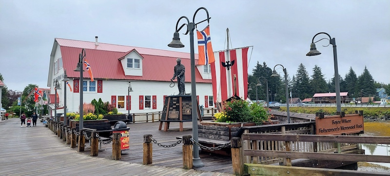 On a mild but damp and drizzly Saturday (July 23), Walt and I meandered about the town of Petersburg, settled by Norwegians and founded on and continuing to prosper because of fishing and seafood canning and shipping. We visited the docks and the “Little Norway” section of town (see picture below), stopped to browse in a bookstore/gift shop, walked by the Episcopal Church (now a meeting hall), had a nice brunch in a bakery/coffee shop (pizza bagels spread with cream cheese are very tasty!), and spent most of our time in the small but excellent Clausen Memorial Museum and Shop that tells the stories of the founding and growth of the town via an informative film and nicely-arranged displays, and presently includes a special presentation about the LeConte and Baird glaciers.