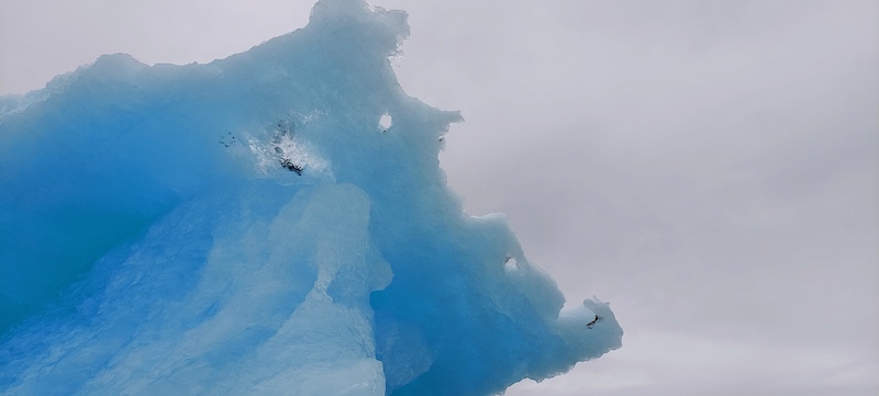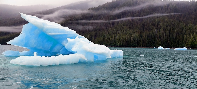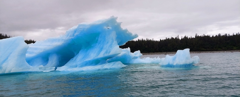 On Saturday afternoon, Walt and I boarded another jet boat that took us and 11 other passengers to Le Conte Bay, about 20 miles southeast of Petersburg, at the end of which the breathtaking 150-ft.-tall Le Conte Glacier looms like a towering blue-and-white ice castle above the opaque turquoise water. On the way to the glacier, we stopped to see pictographs on a rock face and to draw VERY close to a waterfall (our boat was able to bring us within inches of the rocks down which the water poured), and as we drew closer to Le Conte Bay we encountered more and more “bergie bits”–pieces of floating ice in every size and shape imaginable, as if a glass blower in their studio had let their imagination run completely wild ! We stopped RIGHT beside several icebergs and could touch their surfaces.