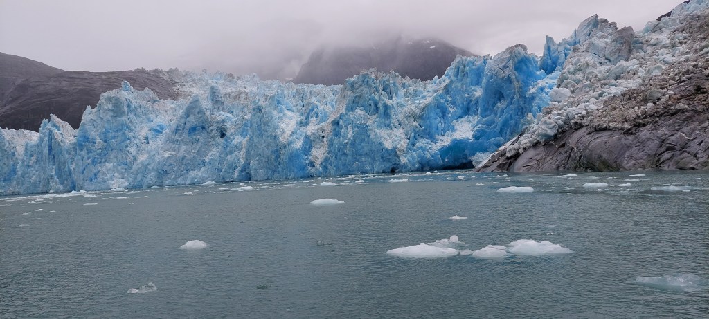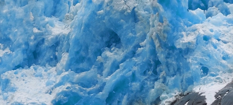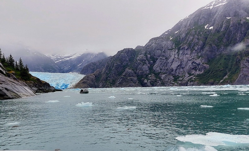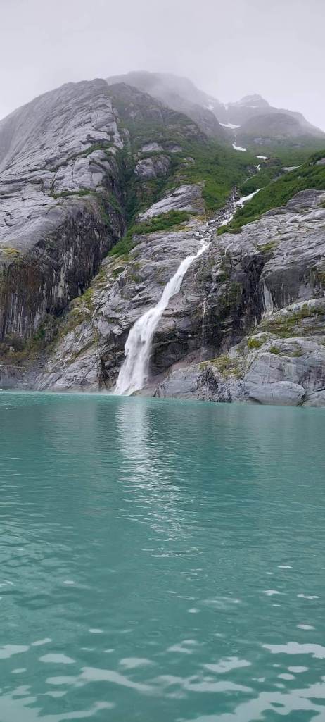 On Saturday afternoon (July 23), our “Seek Alaska” tour boat carried us into Le Conte Bay through mint-green waters, filled with “bergie bits” and larger icebergs, to a position about 900 feet from the face of the Le Conte Glacier. We passed a glorious waterfall and a large ice floe on which we could see a vast number of black blobs–harbor seals and their very young pups! Our captain allowed the jet boat to drift for a long time so that we tourists could watch the glacier “calve.” (When this occurs, chunks of ice, large and small, break off from the face of the glacier and plunge into the water below, causing a great splash, fountains of spray, and waves that circle out from the glacier’s foot, often with rifle-shot cracks of sound accompanying.) Before beginning our journey back to Petersburg, we visited two stunning coves surrounded by gigantic black granite cliffs down which snow-melt trickled, then bounded, and finally gushed out over rocks and into the sea right at our tour boat’s bow! It was incredibly gorgeous, even on a gray day!