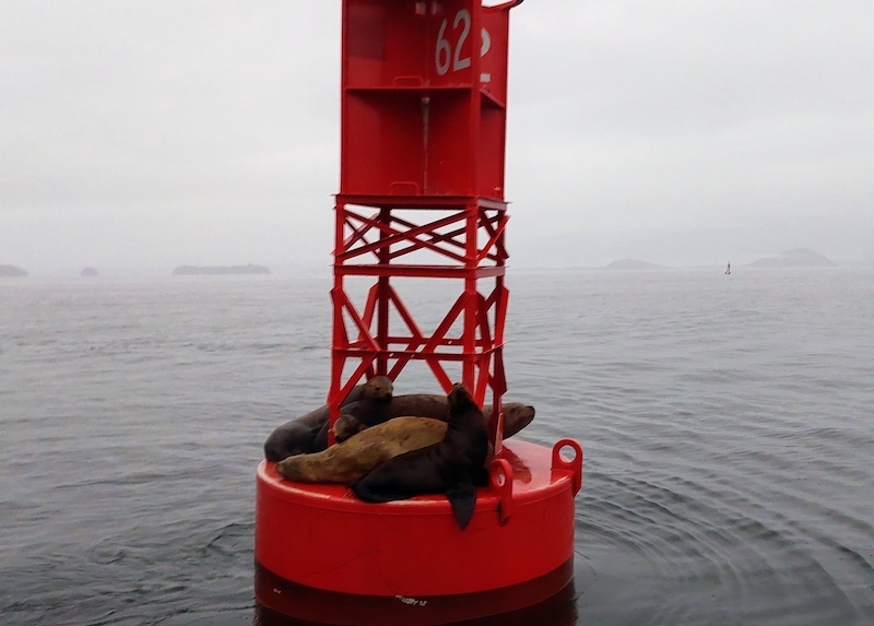 Misty rain began to fall during our return trip. We stopped to glimpse a large whale tale disappearing into the ocean not far away, and to smile at a clump of Steller sea lions lounging about on the base of a marker buoy–their fish smell was rather pungent! We hiked back to Braesail through a soft rain after a day filled with phenomenal sights, and I gave hearty thanks for the opportunity to marvel at God’s spectacular handiwork!