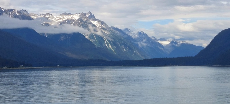 We found comfortable seats on the port side of the main passenger area and watched the cloud-obscured mountains glide by across the glassy water. Temperatures were mild enough to allow for pleasant walking outside around the ferry’s decks. By the time we were approaching Haines, the skies were clearing and the views of mountains and waterfalls along Lynn Canal were marvelous!