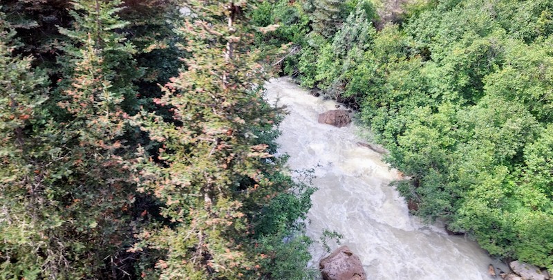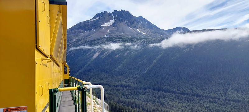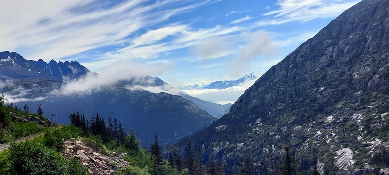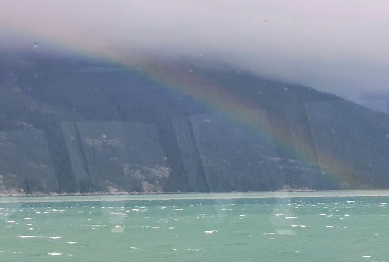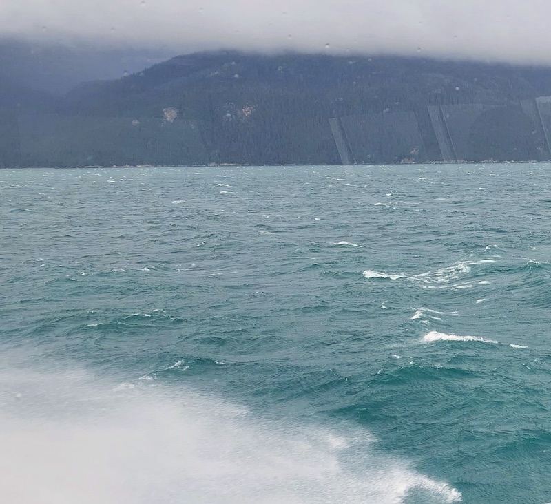 The sun glanced down to observe the starboard side of the ferry for a short time at one point, and the resulting “mist-bow” appears in the photo below above the whitecaps, generated by a wind of about 20 kts., that chased one another through the mint-green waters of the Lynn Canal. The lighter-colored water along the shore comes courtesy of a river outflow and produces eye-catching “stripes.”