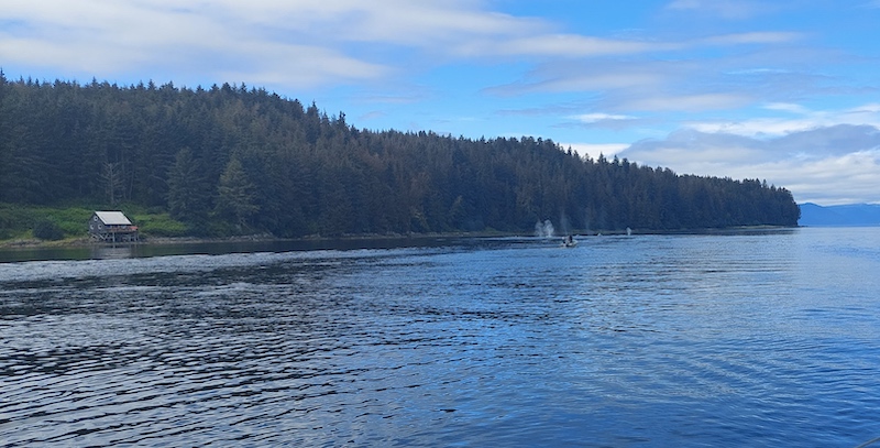 It’s now a sunny Wednesday afternoon and Braesail is anchored near Angoon, a village of about 500 year-round residents on Admiralty Island; its name in Tlingit is Aangóon, meaning roughly “isthmus town.” We motored here from the even smaller village of Tenakee Springs over the course of about 4.5 hours, and as we were approaching Angoon, we were treated to a wonderful whale show: at least five humpback whales, who were probably “bubble net fishing,” spouted and dived and spouted and dived again, singly and in groups, and came very close to the boat as we motored very slowly along! I was too fascinated by their proximity and sounds and movements to use my smartphone camera as I watched their dark arching backs, fountains of blown spray, and splashing fan-shaped tails and listened to their hissing and huffling when they spouted and their occasional grunting, but I did take the pictures above and below in which you can see the whales (four or five) being observed by two people who were following them at a safe distance in a small boat. Excellent whale watching without paying for a formal tour!
