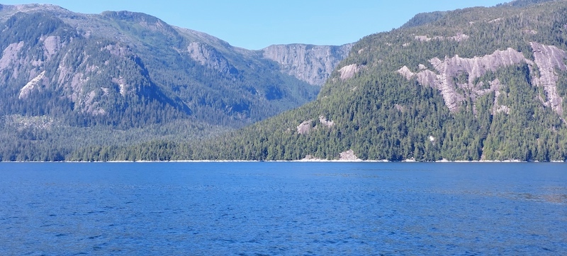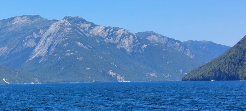 The journey through Verney Passage around Gribbel Island was breathtaking, with giant granite cliffs and peaks soaring skyward to glacier-sculpted basins, down from which the winding silver-white trails of steams and waterfalls can be traced. It was like being in Misty Fjords in Alaska, but without the mist!