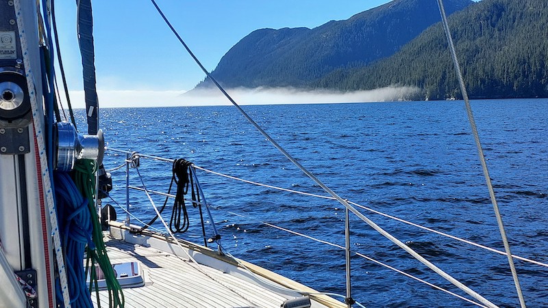 We then climbed up the steep ramp to shore, disposed of the fuel-soaked sorbs, and did a bit of shopping in the Kitasoo Band store. As we left the fuel dock, we could see a woolly wall of fog ahead, and prepared our horn, running lights, and radar accordingly.