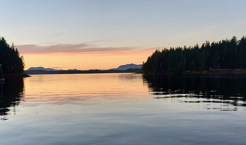 We met our boating friends, Tom and Michelle, who’d arrived on their sailboat Paraiso at the Haíɫzaqv dock ahead of us, and we shared a good dinner and conversation at the dockside pub before gathering our laundry and making use of the center’s fine washing facilities while continuing to chat. We will stay in touch as we travel, and hope to meet in person again; they’ll be returning to their home in the Portland, OR, area at about the same time–late October/early November–that we plan to be back in Everett. We enjoyed the sunset over the harbor and being able to see some of the brighter stars in a fog-free sky as we transported our laundry and planned Thursday’s travels.