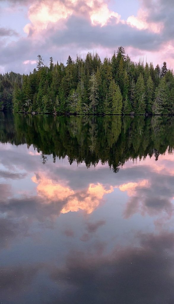 Paraiso followed us through the circuitous passages of Murray Labyrinth and then her crew, Tom and Michelle, joined us for a scrumptious dinner in Braesail’s cockpit; Michelle provided some shrimp that they’d caught, and Walt served as chef. We had a marvelous meal and visit and caught several glimpses of seals and otters investigating Tom’s prawn trap!