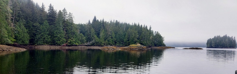 Wednesday’s skies were pouty and gray until early afternoon, but the clouds kept any rain to themselves and meandered away later on. After motoring around the head of Grappler Sound and observing the roiling tidal rapids near one end, we decided that we had lots of travel time and thus would rather go on to a group of islands near the entrance(s) to vast, granite-and-forest-lined, very lake-like Broughton Lagoon. Since there was little wind, seas were smooth, our course was straight, the shores were distant (meaning that there wasn’t much outstanding scenery to enjoy), and the engine was generating plenty of hot water, I took a shower in the aft head while we were motoring and Walt was on duty at the helm. Looking out the shower stall’s window at the water and hills “passing by” as I was performing my ablutions was rather fun!