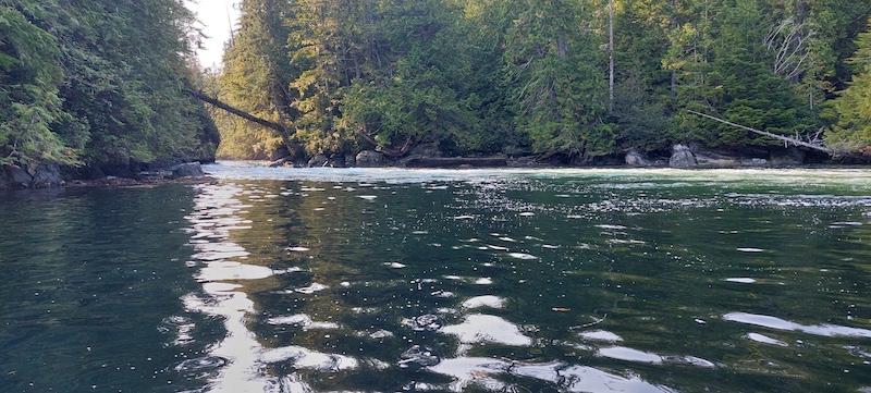 We visited two other sets of rapids that were also plunging from our anchorage into the lagoon and spreading sea foam, leaves, twigs, and other surface debris across the water. We spent the next two hours touring some of the perimeter of Broughton Lagoon as we waited for slack tide and then the change in direction of the rapids that would propel us back into our anchorage, trying one set of rapids and then another, and finding that the currents that were still running against us in all three were simply too strong for Coracle’s Honda small outboard motor to fight successfully, and we had to let the currents spin and shove us back into the lagoon. The sun was warm when it wasn’t playing hide-and-go-seek among the hills near the rapids, but the small breeze ruffling the water was quite cool and I was glad I was wearing my windbreaker over my sweatshirt as we bounced across the wavelets near the rapids and greeted a sleek, black seal whose head popped up very near Coracle’s side.