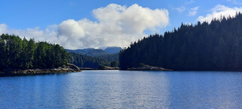 Waddington Bay was gorgeous by the time we left shortly after noon on Friday, September 16. We motored to and around Village Island, on which one can find the abandoned Indigenous community of Mimkwamlis, the ancestral home of the Mamalilikulla First Nation. Tours of structures that the forest is reclaiming can sometimes be arranged, but we have not been able to do that.