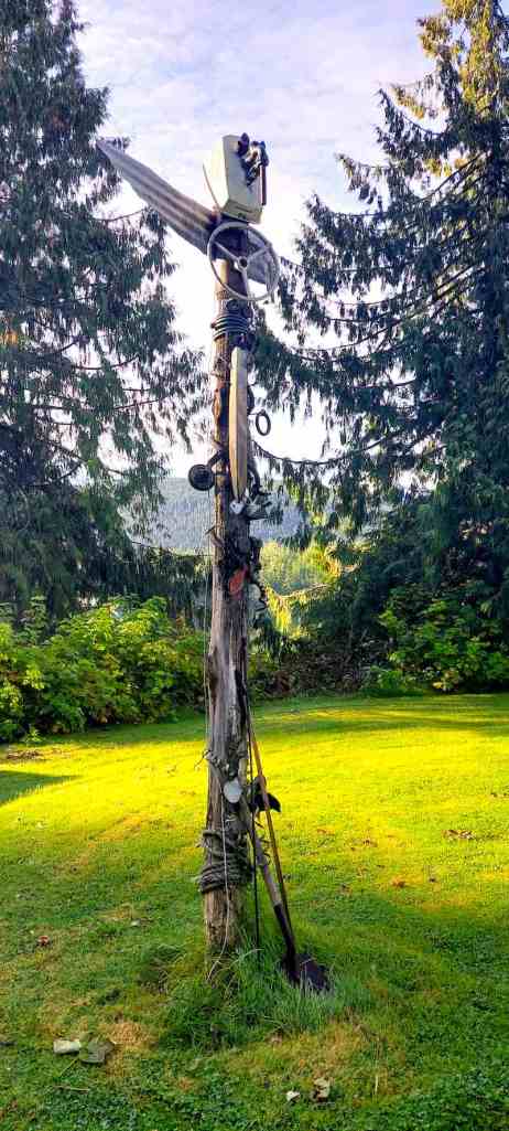 While we waited for the fog to thin in Lagoon Cove (located at the top of East Cracroft Island) on the morning of Saturday, September 17, my friend Michelle and I walked along the docks, across the bridge over the creek, and up the hill to the lovely house occupied by the marina’s owners, Dan and Kelly. Through the garden and down the slope at the back of the house we went, enjoying views of gauzy streamers of fog drifting over the marina below us and winding around the green velvet hills beyond it.