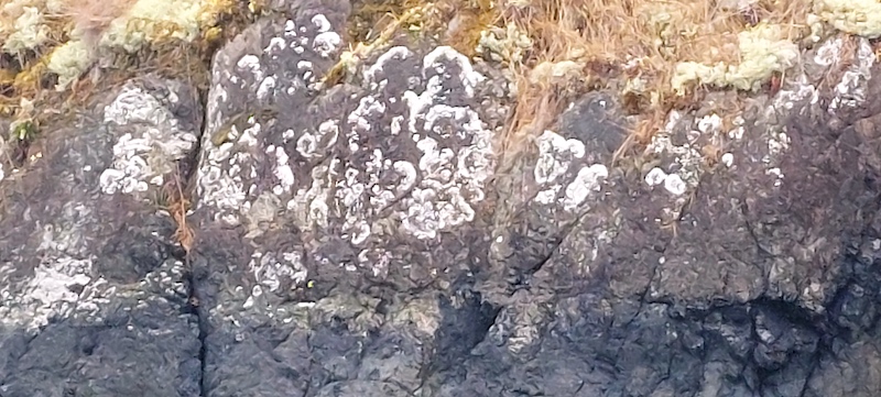 Occasional sprinkles splattered us as we walked around the homestead and back through the meadow and the woods, but we arrived back at the spot on the beach where we’d tied Coracle to a log feeling only a little damp. Back we motored to Braesail, and I loved looking at the lichens decorating the massive rocks along the shore.