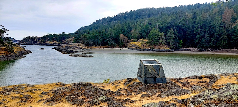 A little rain did arrive during Tuesday night, and as a result, we spent Wednesday, September 28, in lovely Deep Bay, where small swells rocked Braesail from side to side all morning, and I was more comfortable reading up in the cozy cockpit. By noon, sunbeams had put most of the showers to flight, and Walt and I decided to take Coracle to the head of the bay and walk the trail through the forest to the meadow to the orchard to the outbuildings to the dilapidated farmhouse to the shore of Home Bay, all part of a homestead that was sold to the British Columbia government and is now theJedediah Island Provincial Marine Park.