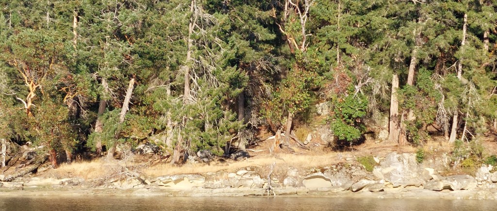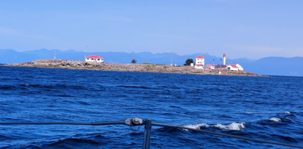 Walt purchased propane for our stove in Nanaimo on the morning of Friday, September 30, getting some good walking exercise in the process, while I rested and wrote and recovered from some dizziness with which I’d awakened in the morning. Our two-hour journey from the docks of the Nanaimo Yacht Club through scenic Gabriola Passage to Pirates Cove on De Courcy Island (which we’ve enjoyed visiting in the past, most recently shortly after Christmas of 2021) took us past shores presenting galleries of sculpted sandstone, several gliding seals, the Entrance Island Lighthouse,