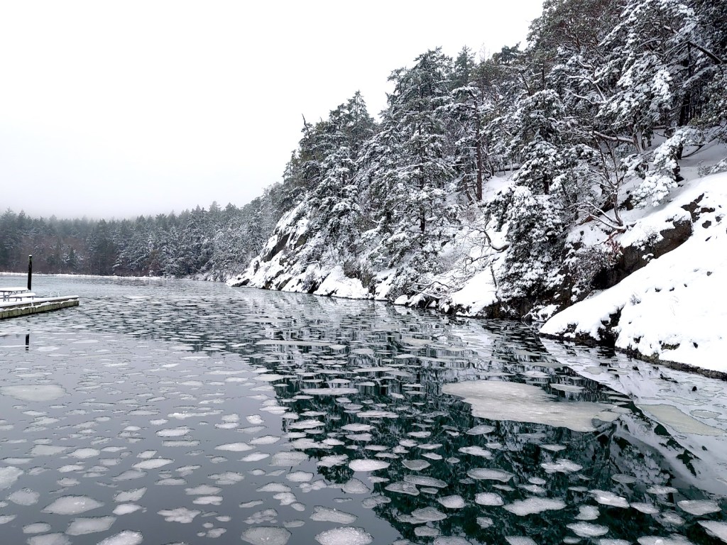 We drove the 50 miles back to the boat on a silvery Sunday morning with more boat parts, tools, food, AND the wine, and Walt was soon able to locate and stop the water leak. We finished loading the boat, and spent the afternoon motoring over still, shining seas to Reid Harbor on Stuart Island over the course of about five hours, spotting the nose of a seal poking up through the water in the harbor, watching large flocks of water birds feeding, and seeing some deer grazing on Speiden Island’s velvety green slopes. One small boat was tied to the dock near the snowy shore of the marine park, so we moored Braesail behind it, being very careful not to slip on the dock’s icy boards as we secured the lines.