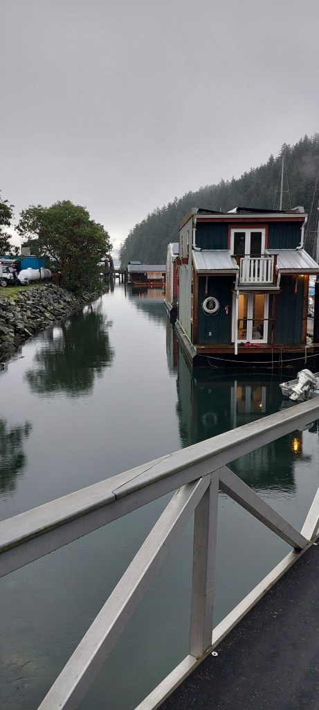 Ignoring the occasional soft drizzle, Walt, Martin, Hans, and I enjoyed a good walk around the town of Snug Cove that surrounds Bowen Island’s Union SteamShip Marina. We found a well-stocked general store, an organic produce market, a bakery or two, a well-resourced library, several gift shops and boutiques, a brewery, a distillery, a comfy pub, several cafes and restaurants emitting attractive odors, a pharmacy, and a boatyard, among other small businesses. What a delightful small community! I visited the marina’s wonderful boaters’ clubhouse on the shore–I’d spent some time there during a visit in the spring of 2022–and conversed with a friendly couple living aboard their boat in the marina.