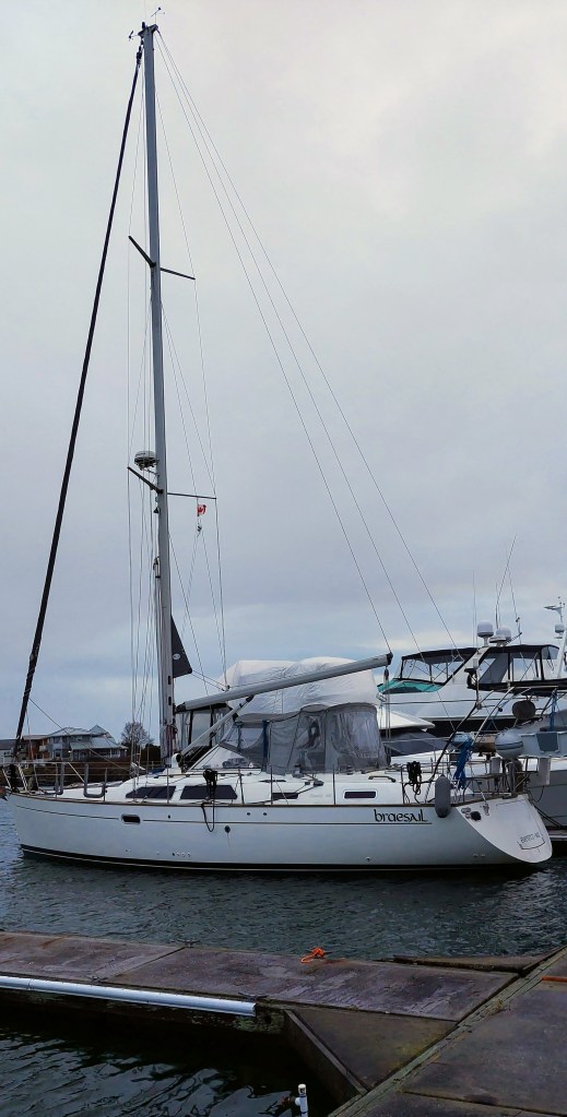 Most of the five-hour motoring trip we made from the Burrard Yacht Club in Vancouver to the Point Roberts Marina was uneventful, despite moderate headwinds and the waves into which we slapped and splashed. As we approached the shelter of the marina in mid-afternoon, however, the rain on the windscreen kept us from reading the not-well-positioned “DO NOT ENTER” sign near the marina’s mouth until Braesail’s keel had squished into the muddy bottom of the channel! Using the bow thrusters and reverse gear, Walt rocked the boat free, we back-tracked to the correct marina entrance, and approached the US Customs dock. Walt had tried to use the official Customs check-in app much earlier, but it would not work on either of our smartphones, so he decided to tie up at the Customs dock and get clearance for our return to the States once we had docked.