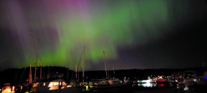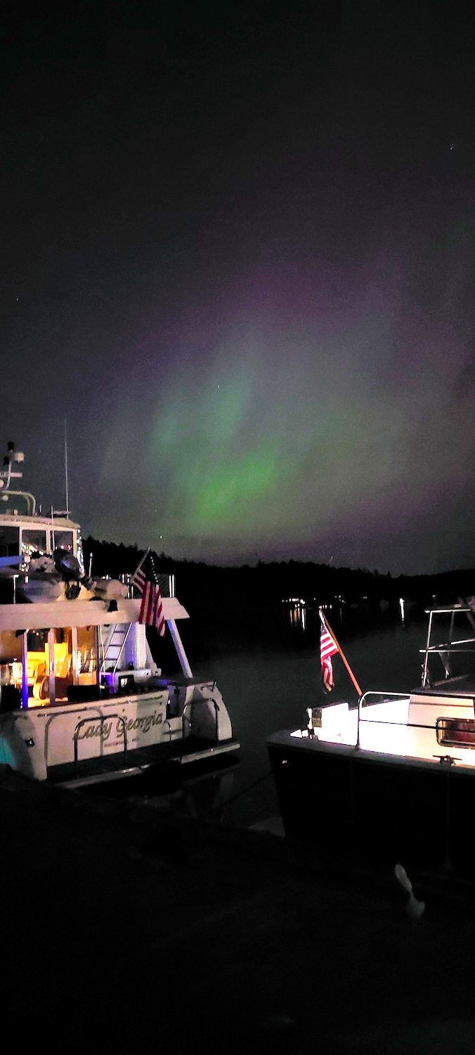 Shortly before midnight, when the aurora’s colors were fading and curtains of milky gauze, through which some especially-bright stars were winking, were draping the heavens and shimmering above the lights of the town and the marina, I climbed down the companionway stairs, performed my nightly tooth-maintenance routines, and crawled into bed, so thankful that I had been blessed to witness God’s glory in this spectacular way!