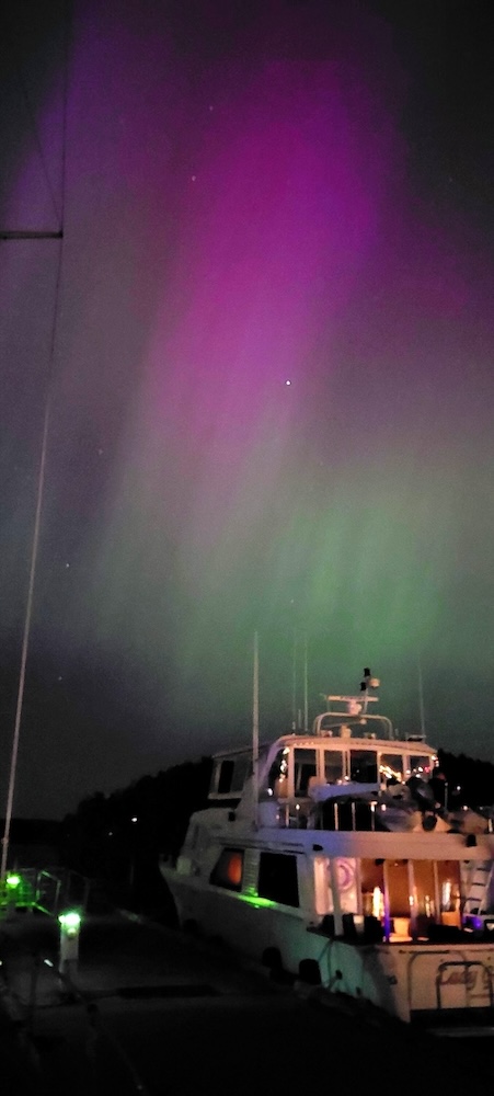 The fancy salmon and roast beef dinner, held in a community center in downtown Friday Harbor in the evening, was very pleasant–the food was not spectacular, but the round-the-table company of other boat owners was excellent. I scanned the skies for more Northern Lights once I was back on Braesa (Walt had returned by ferry, taxi, and car to our Everett home because he was leading Sunday morning worship at St. Philip’s Episcopal Church located in a town just north of Everett), but they contained only stars, a sliver of moon, a winking seaplane, and a few clouds–no auroras. I slipped into bed thinking of the sky-full of wonders I’d beheld on the previous night, and giving God, THE finest of all artists, hearty thanks and praise!