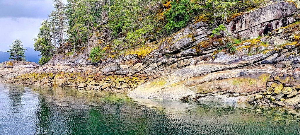 I especially enjoyed observing the changing light on the shore as clouds came and went and the tides rose from 24 ft. to 39 ft. and fell again. I think that the shores’ rock formations resemble huge, uneven multi-layered cakes placed on a rippled-water plate, with colored rock-crumbles sprinkled along their bottoms, variegated moss-frosting smeared around their sides with drips of black granite trickling down here and there, and a thick green topping of trees finishing off the visual dessert!
