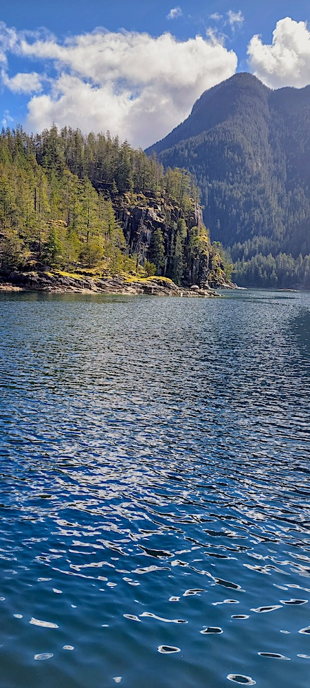 Most of Tuesday was absolutely wonderful: We left Laura Cove at about 10 am under sunny skies, and motored for a shorrt while until a tailwind began to chase us up Toba Inlet as it wends its watery way into the snow-crested B.C. Coast Mountains. We raised the genoa (the large headsail at the bow of the boat) and enjoyed smooth and comfortable sailing for two hours as we admired the shoreline scenery: mammoth granite “massifs,” cloud-piercing peaks, green-velvet glacier-carved “hanging” valleys, and wondrous waterfalls of all lengths and configurations, from slender, twisting threads to foamy, splashing cataracts, that somehow found paths from glittering snowfields, through thick forests, into the sea.