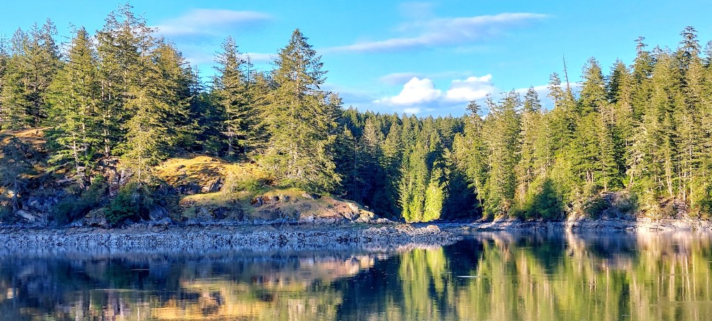 After a tranquil afternoon and evening of reading , editing photos, and blog-post-writing, Walt crawled into bed and I climbed out onto the deck to observe a black-satin sky strewn with glittering stars—I was even able to see, for the first time in AGES, a little of the misty Milky Way pouring across the midnight sky! There was still a faint glow of light at the northwestern horizon, and trees on the cove’s shores were discernible. The air was silent and the water’s surface was silky, but I could hear soft splashing where the waters of the cove and the reversing tidal lagoon at its edge flow back and forth as the tides rise and fall. What a blessed night!