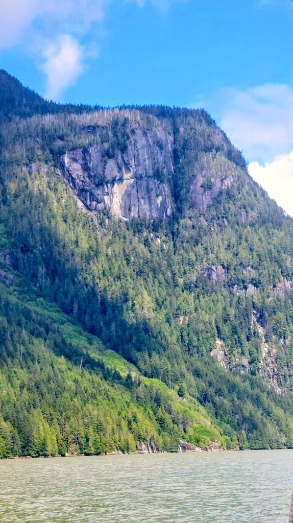 We turned around at the head of the magnificent inlet and motored into the wind, back past the multi-colored massifs staring out over the milky jade waters of the inlet and the many crystalline cataracts, some like thin gauzy veils, some like wide patches of snow, and some like long, narrow satin ribbons draped over a dozen or more tiers of rock, glittering white against the ebony granite.